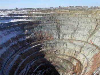 Hace ya un tiempo me enviaron un fichero de PowerPoint llamado «el ombligo del mundo», y me llamó la atención que este ombligo estaba en Rusia. Se trata de una mina de diamantes situada en la ciudad de Mirna (en Siberia), un cráter artificial que tiene 525 metros de profundidad y 1,25 kilómetros de diámetro. Espectacular, sobre todo la vista aérea.